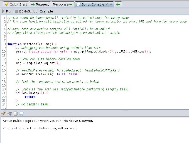Active Scan. Underneath the panel displaying the script is another panel which shows the script output.