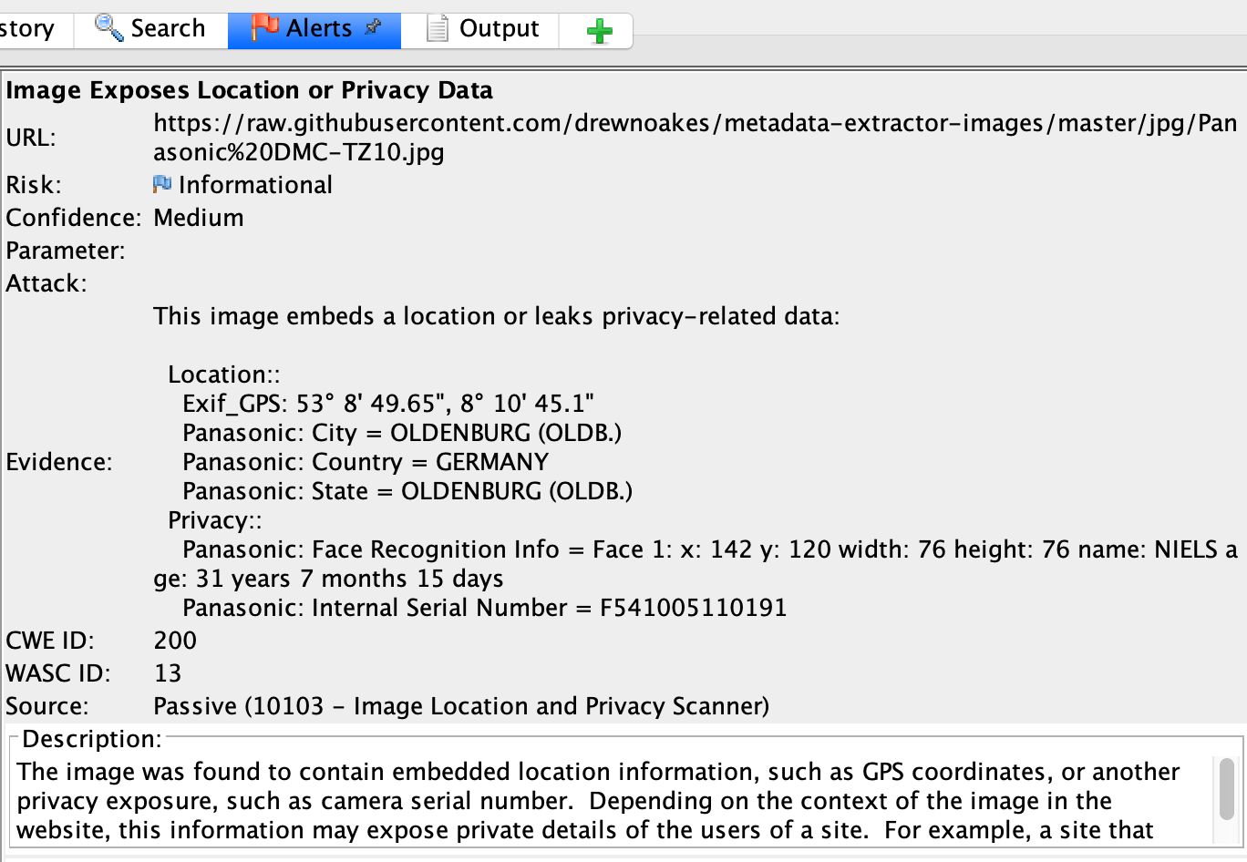 This software scans images to find the GPS information inside of Exif tags, IPTC codes, and proprietary camera tags. Then, ILS flags the findings in the ZAP Alerts list as an information message. It would be up to the auditor to determine if location exposure is truly a security risk based on context.